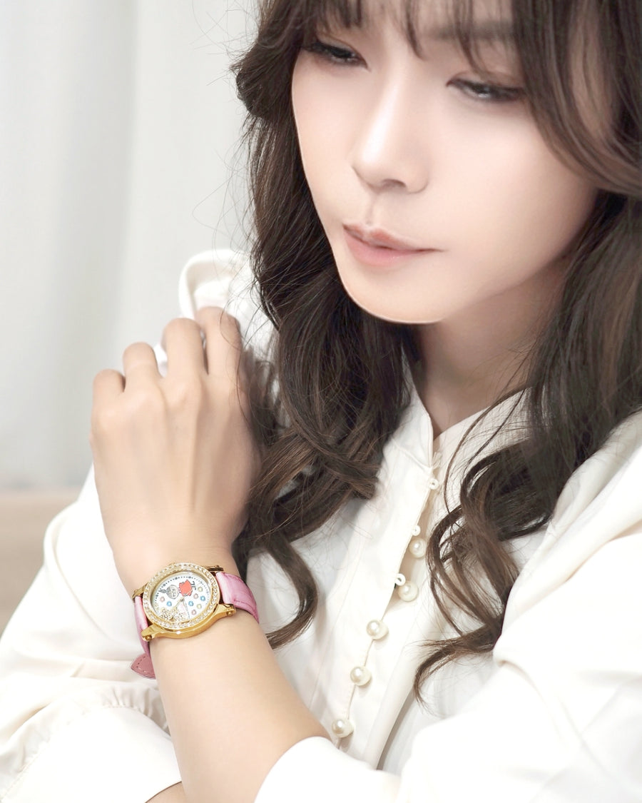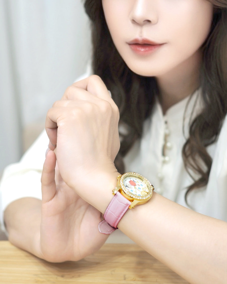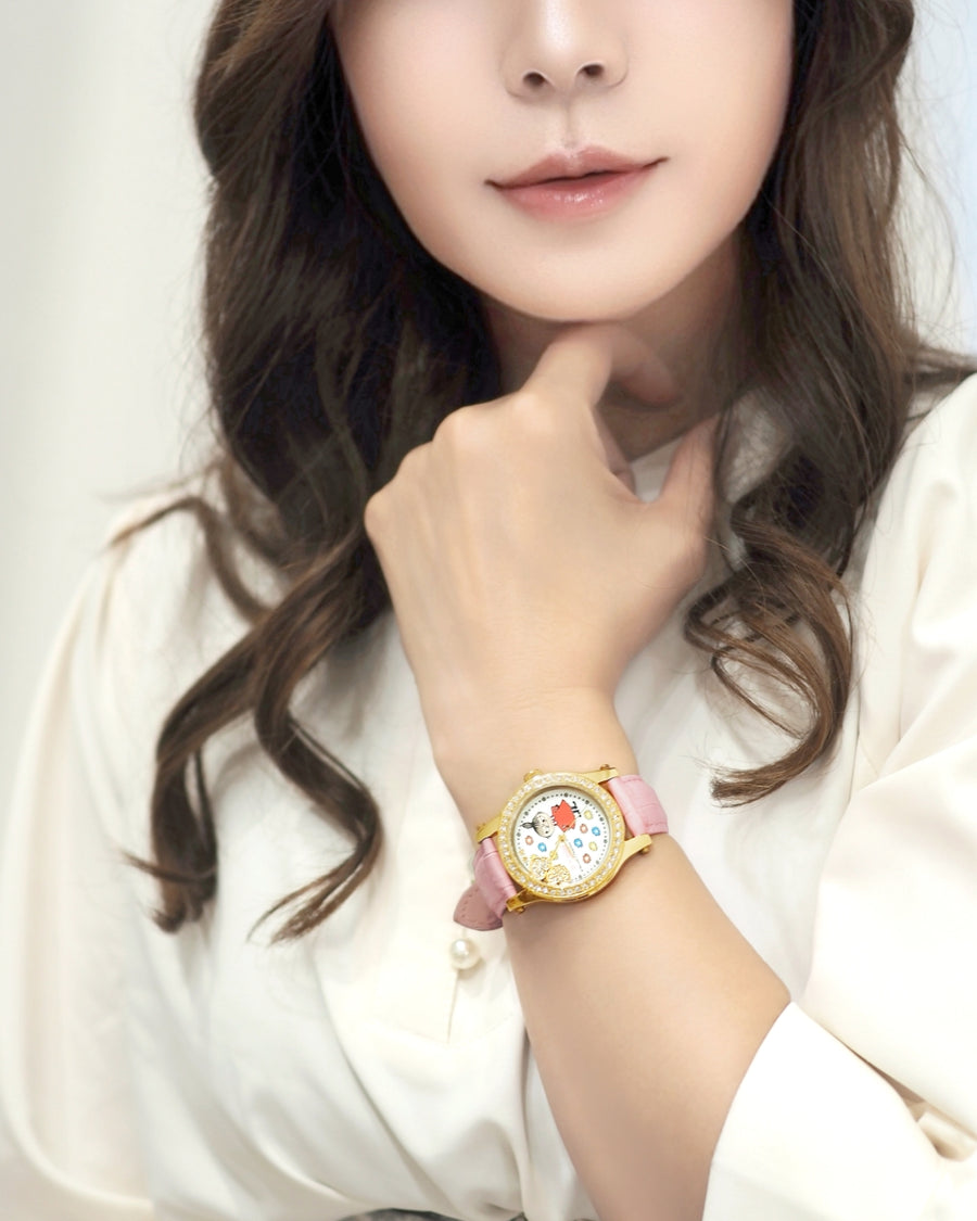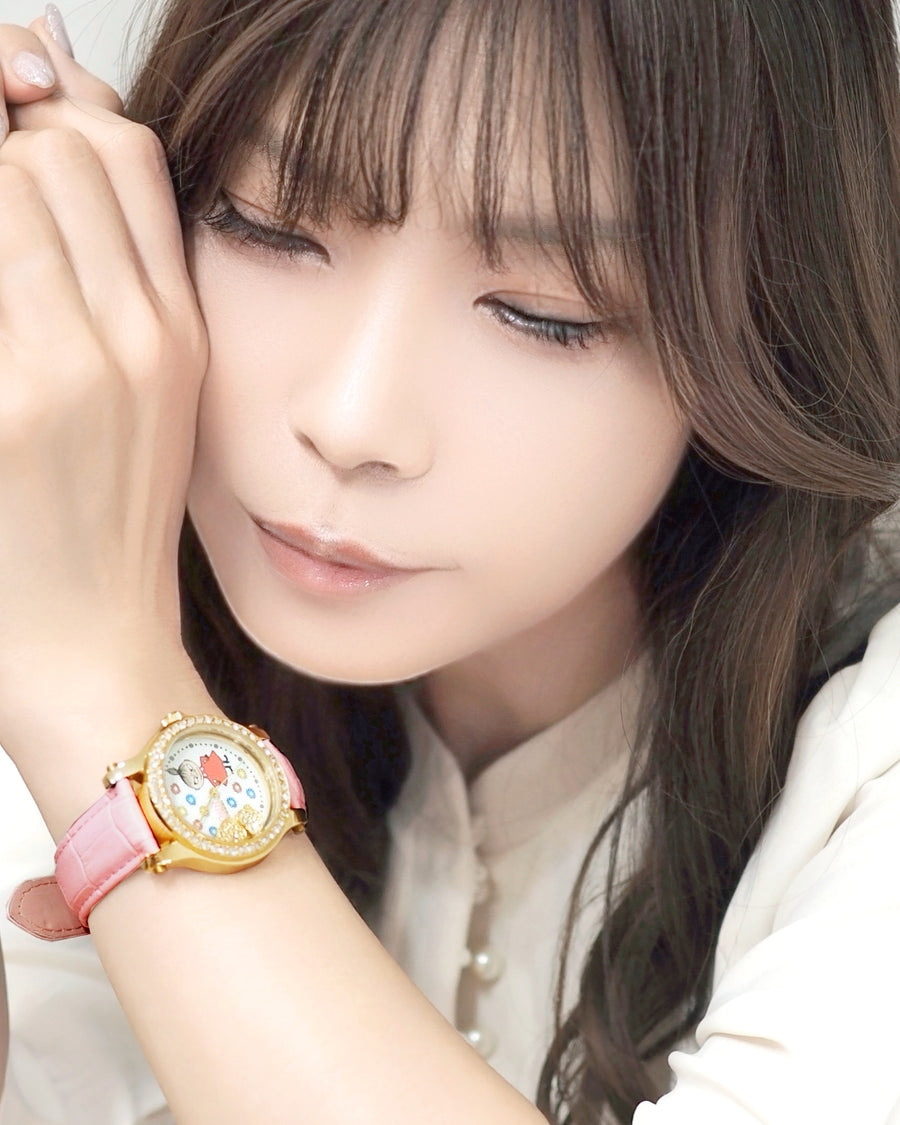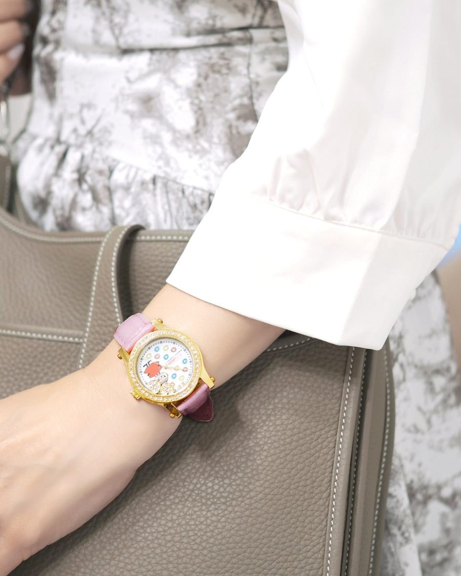 クリスタルガラスを贅沢にちりばめたゴールドのラウンドフェイス。文字盤の中でクリスタルガラスをちりばめたローリングハートが躍る。