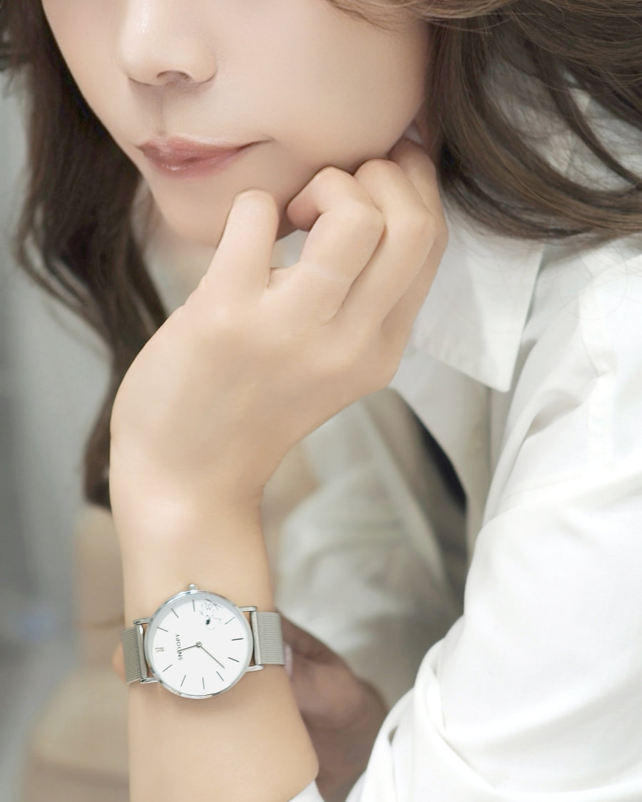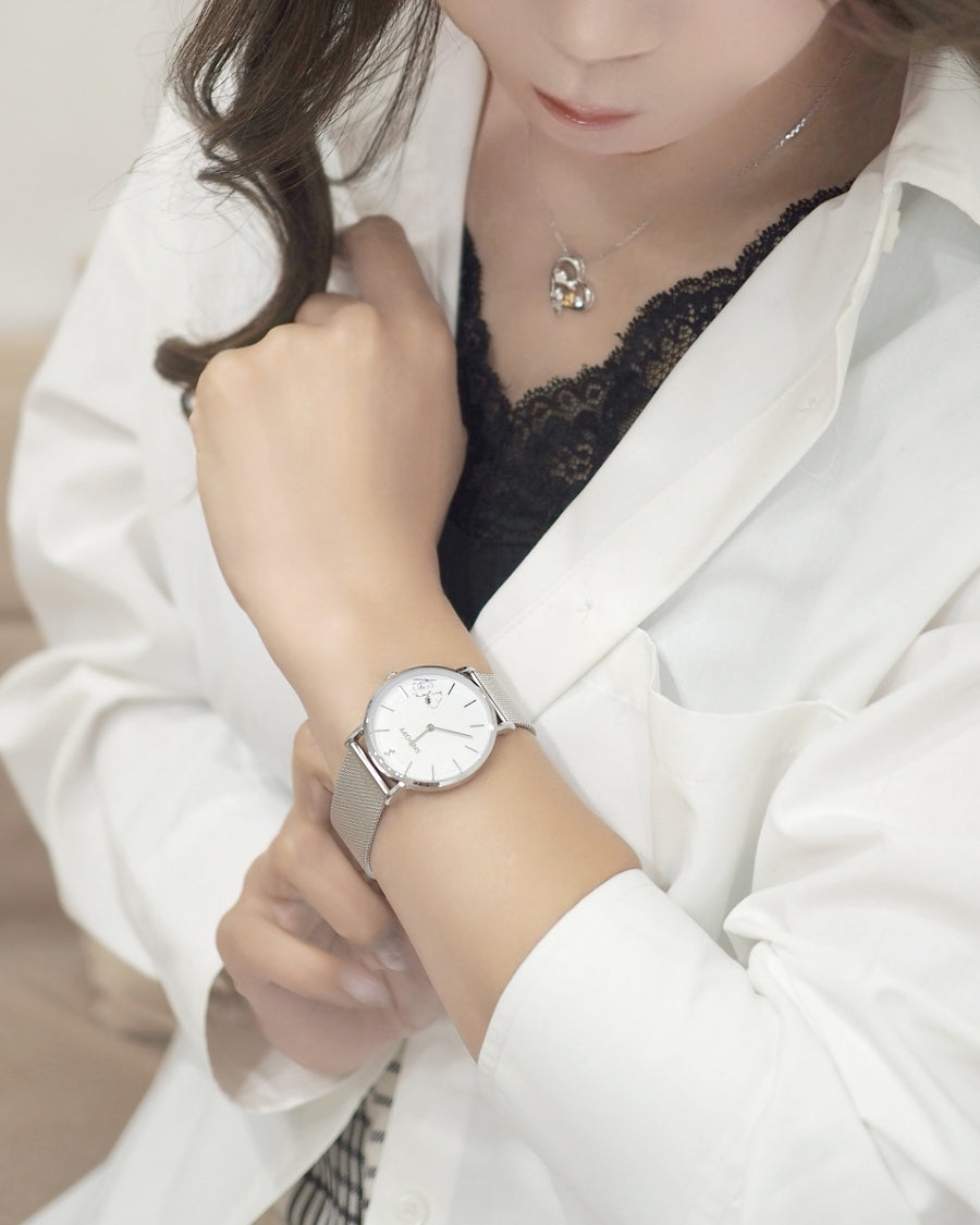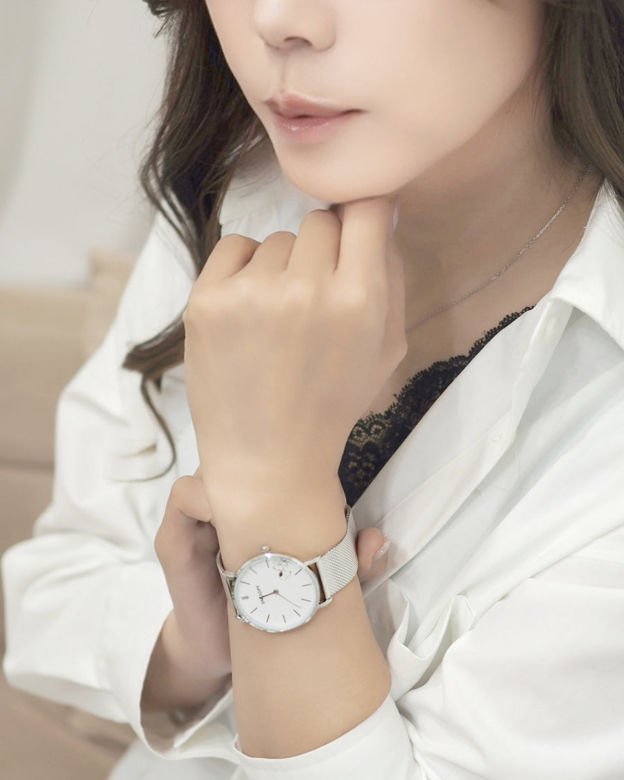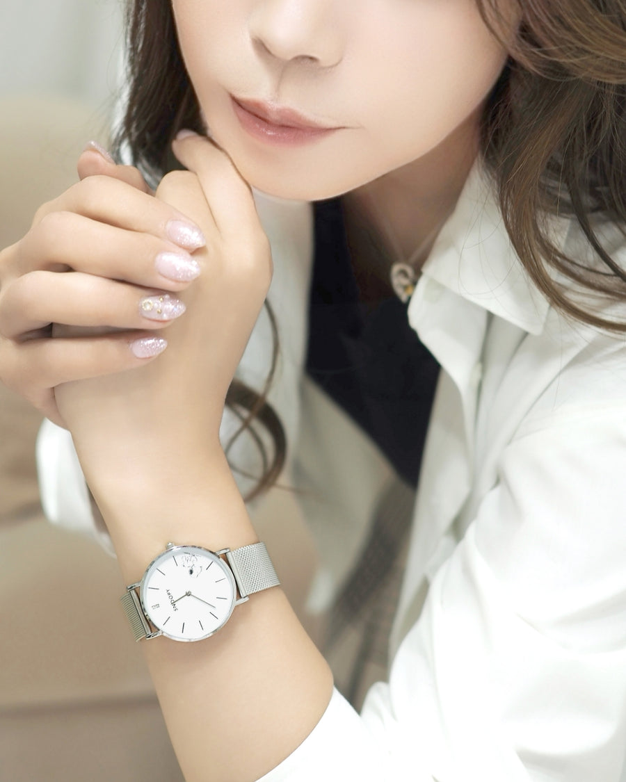 実用的な超薄型文字盤、2針アナログ表示(時針&分針)。手首にやさしくフィットする丸みを帯びたラグで、長時間の着用も疲れにくい。