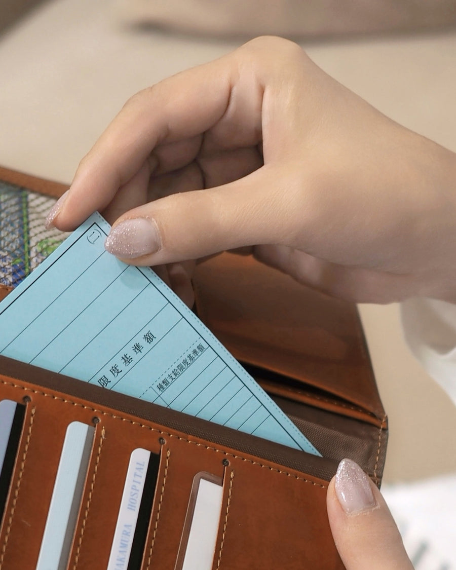 保険証、診察券、お薬手帳など、どこへしまったか忘れがちなものをまとめておけば、急な診察の時でも慌てずスムーズに。カードも9枚の収納が可能なので、かかりつけの病院が複数あっても安心です。